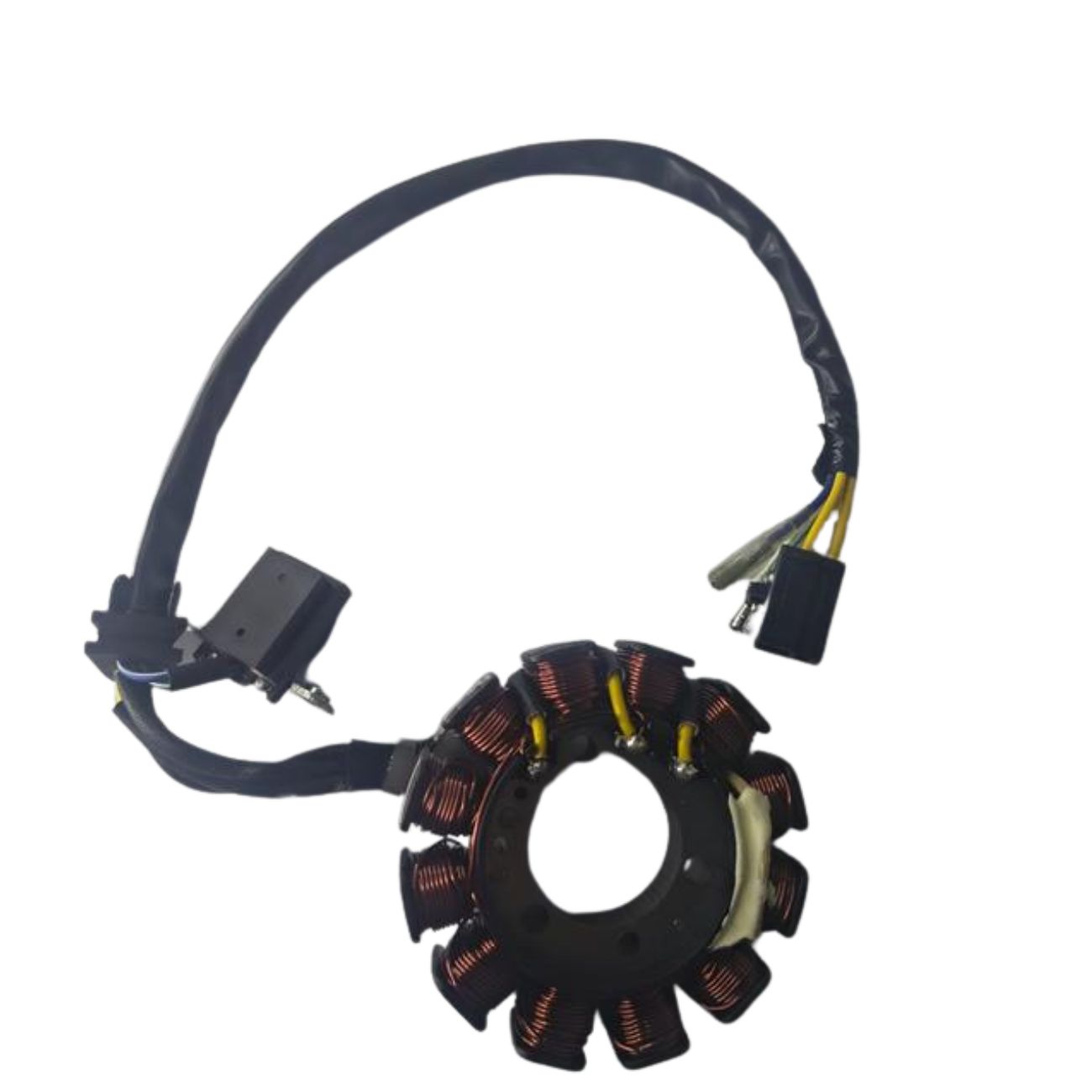 Aplicação: Estator do magneto para motocicleta Haojue Nex115, componente do sistema de ignição/geração de energia elétrica responsável por produzir corrente alternada para a bateria e circuito elétrico da moto.